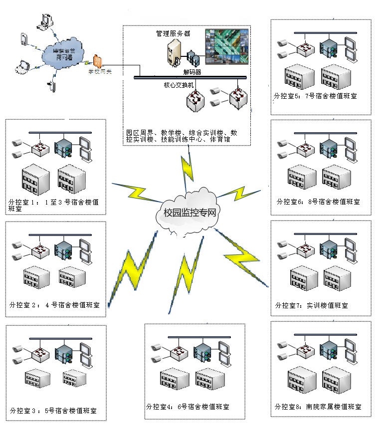 (5)值班室監控建設在各教學樓、各宿舍樓、各行政管理單位的值班室內,主要設備有顯示設備和控制設備,可以對本分控管理范圍內的設備進行視頻瀏覽、設備控制等操作。